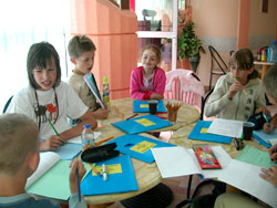 Dzisiaj robiliśmy papierowe kukły -PUPPETS. Wszyscy pochłonięci byli wymyślaniem sposobów na zrobienie włosów, ubrań i części ciała, które można było rysować bezpośrednio na kukle lub doklejać.