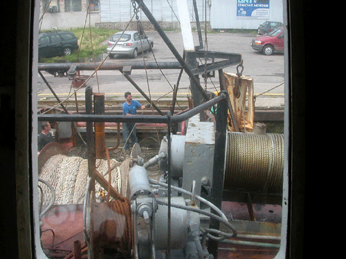 Jeden z rybaków przytrzytmuje stalową linę, którą właśnie wciąga Bartek |